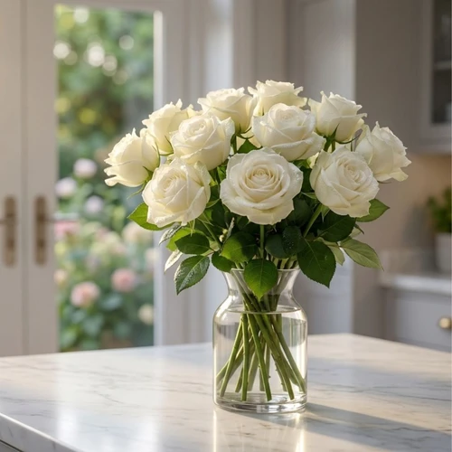 Door beschikbaarheid van de witte rozen kan de vorm of de kleur iets afwijken van de foto.