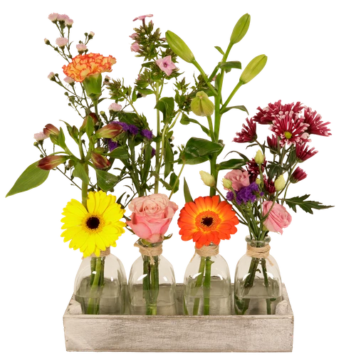 Mooie flessen gevuld met bloemen in een houder, deze wordt kant en klaar geleverd door BoeketCadeau.nl.