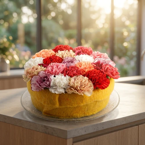 Een bloementaart gemaakt van uitsluitend alleen anjers in diversen kleuren. Een prachtig schouwspel aan kleuren in deze anjer bloementaart.