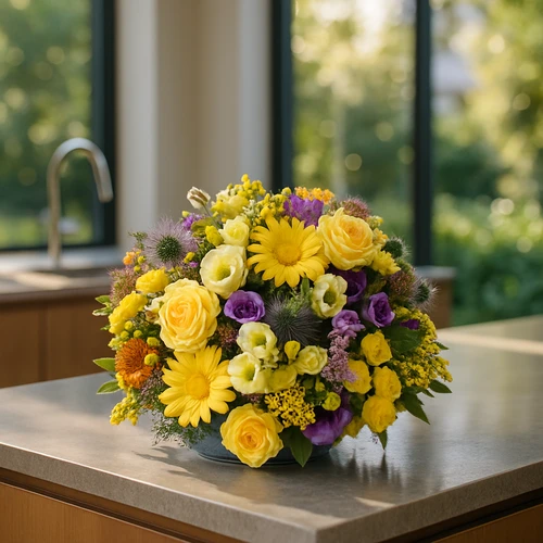 Dit ronde bloemstuk is zo neer te zetten op tafel door de ontvanger. Het bloemstuk dat bestaat uit gele en paarse bloemen van het seizoen is opgestoken in steekschuim en zit in een waterdicht bakje.