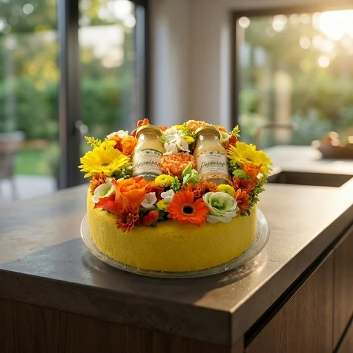 Een bloementaart in vrolijke kleuren in het geel en oranje met twéé heerlijke flesjes Olmenhorstsappen.