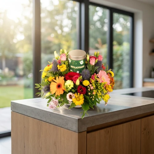 Een biedermeier in bont kleuren is een vrolijk geheel. In het midden heeft BoeketCadeau.nl een blikje gefeliciteerd snoep krijtjes geplaatst. Uniek en alleen verkrijgbaar bij BoeketCadeau.nl