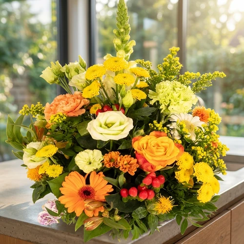 Belangrijk is dat dit bloemstuk millefleur niet in de zon of op de tocht komt te staan.