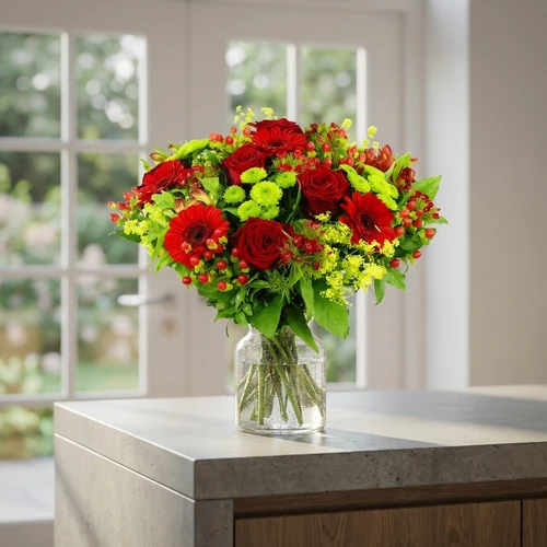 Door de beschikbaarheid van de rode bloemen kan dit boeket afwijken van de foto.