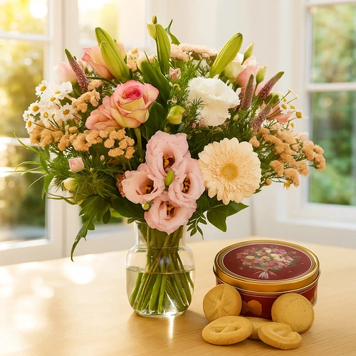 Een vers boeket bloemen samen met heerlijke koekjes in een luxe koektrommel. Deze combinatie is voor vele gelegenheden geschikt om cadeau te geven!
