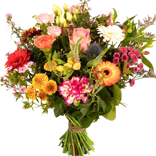 Breng kleur en vrolijkheid in huis met dit prachtige bonte boeket van verse bloemen. Elk boeket wordt met zorg samengesteld door ervaren bloembinders en bevat een harmonieuze mix van seizoensbloemen in levendige kleuren.