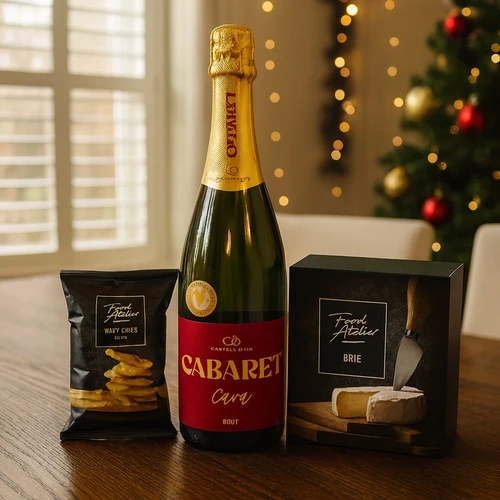 Een kerstpakket met een heelijke bubbel een Cava cabaret en een lekker brie kaasje en een zakje ribbel chips. Heerlijke combinatie om van te genieten tijdens de kerstdagen.