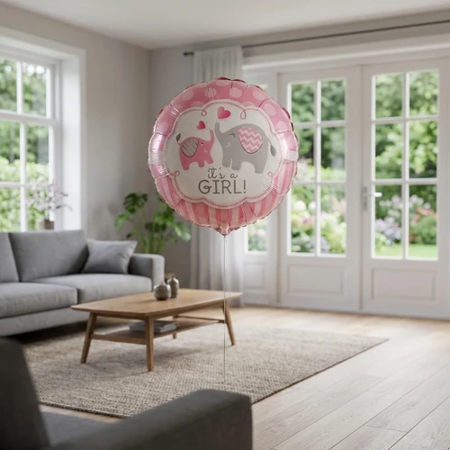 De geboorte meisje ballon wordt compleet geleverd, gevuld met helium, voorzien van een lint en met een gewichtje er aan.