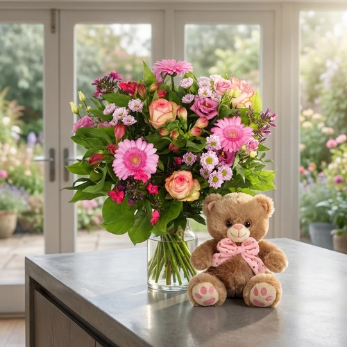 Afgebeeld: Boeket roze groter + knuffelbeertje ca. 20cm
