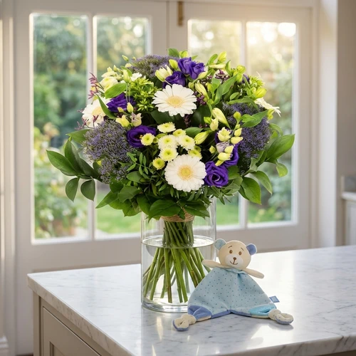 Geboorte boeket bloemen voor een baby jongen in de kleuren wit blauw paars en een pluche tutteldoekje met een beertje er op en een bijtring. Een prachtig zinvol kraamcadeau voor een jongen.