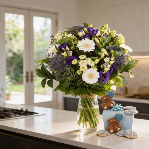 Een vers boeket blauw-paars-witte bloemen van het seizoen en heerlijke geboorte chocolade samen bezorgt in een luxe geschenkdoos. De bloemen worden op water vervoert zodat deze vers aankomen bij de door jou gekozen ontvanger.
