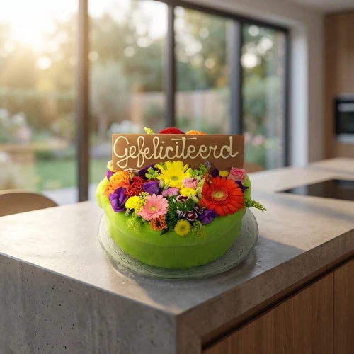 Een bloementaart een echt origineel cadeau met een gefeliciteerd reep er in verwerkt.