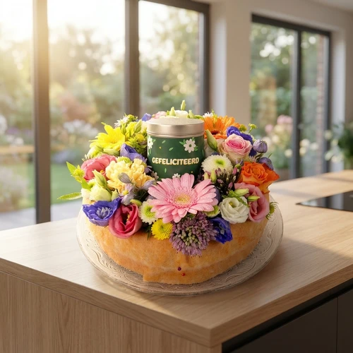 Gefeliciteerd bloemen zijn er in vele soorten, maar niet zo uniek als bij BoeketCadeau. Bloemen verwerkt in de vorm van een bloementaart en een beterschap blikje dropkrijtjes (190 gram) in het midden van de bloementaart verwerkt.