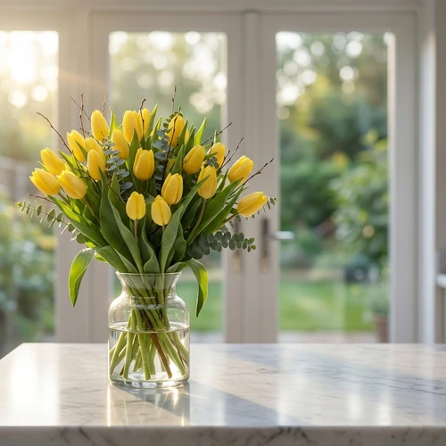 De kleur geel van de tulpen kan iets afwijken door de beschikbaarheid.