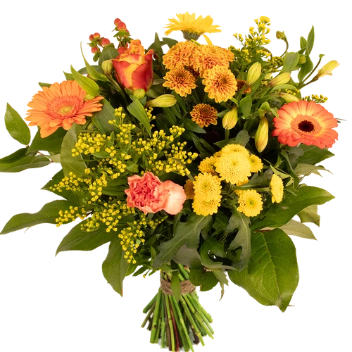 Boeket in vrolijke kleuren geel en oranje deze kleuren passen prima bij elkaar omdat dicht bij elkaar in de kleuren cirkel staan.