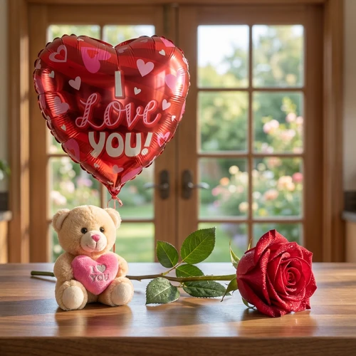 Heliumballon gevuld met heliumgas en een gewichtje er aan. De hart I love you heliumballon wordt gevuld geleverd met een verse rode roos en een knuffel sleutelhanger. Een mooi cadeau voor jou geliefde, voor zomaar of als verrassing met Valentijnsdag.