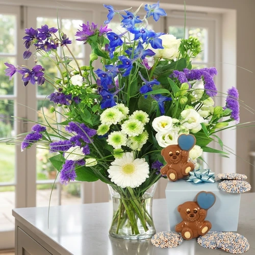 Een geboorte plukboeket bloemen voor een jongen in de blauw paarse witte kleuren en overheerlijke geboorte chocolade, dit alles wordt samen bezorgt in een luxe geschenkdoos.