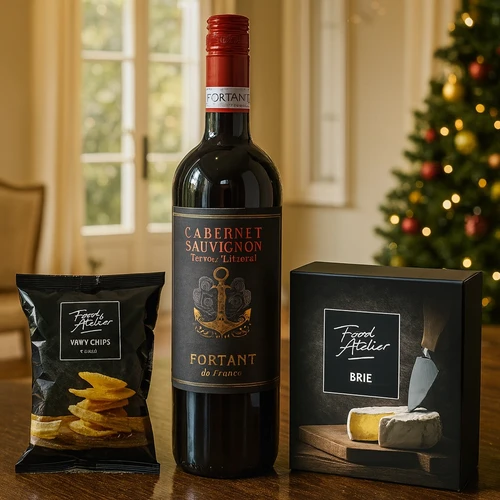 Een geschenk voor kerstmis. Een heerlijke fles franse rode wijn sauvignon en een bijhorende brie en een zak ribbel chips. Een mooie vriendelijke attentie voor de kerstdagen.