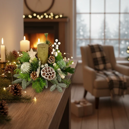 Een kerststuk met een dikke kaars die groen goud kleurt met een glitter er in verwerkt. De kerstmaterialen zijn afgestemd op de kleur van de kaars. En de kerstmaterialen zijn bijpassend verwerkt in het kerststuk. Haal de kerstsfeer in huis en bestel eenvoudig dit mooie kerststuk.