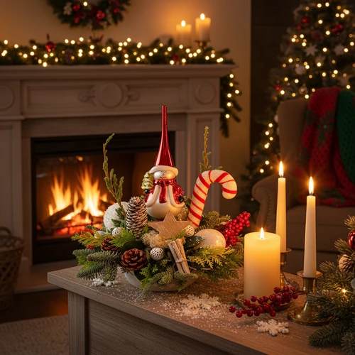 Een kerststuk ambachtelijk gemaakt met een piek er in verwerkt. De sneeuwpop piek. Een uniek kerststuk die alleen verkrijgbaar is bij BoeketCadeau.