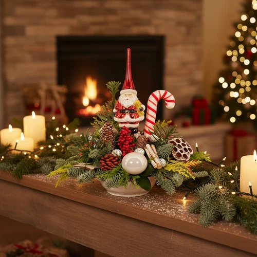 Een kerststuk ambachtelijk gemaakt met een piek er in verwerkt. De kerstman piek. Een uniek kerststuk die alleen verkrijgbaar is bij BoeketCadeau.