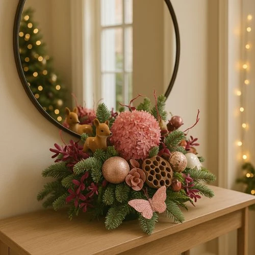 Een rond kerststuk in de roze en paarse tinten met goud en glitter in het het kerststuk verwerkt. Een kerststuk helemaal van deze tijd.