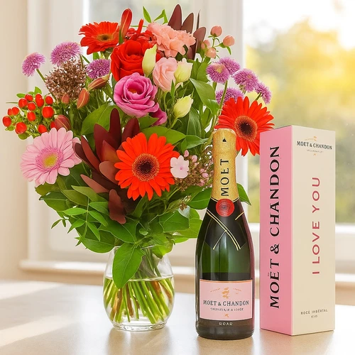 Bloemen voor de liefde en Champagne rosé van Moet Chandon geef deze cadeau en gegarandeerd een succes voor de ontvanger!