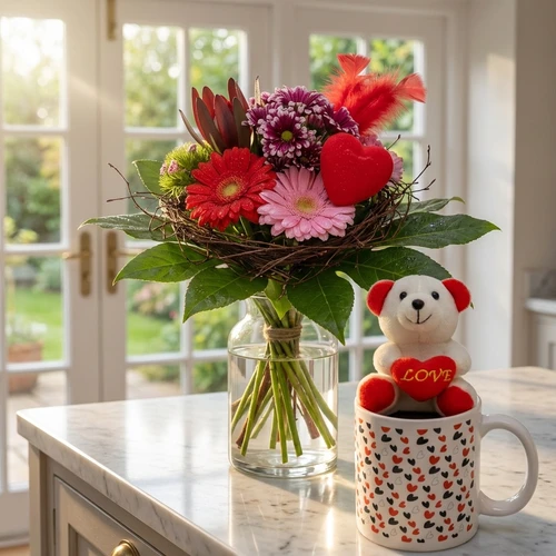 Een boeket gemaakt in een hartframe in de roze en rode tinten, een rode veer en en rood hart maakt het liefdes boeket compleet. Daarnaast wordt dit liefdes cadeau geleverd met een mok waar een knuffeltje op zit. Een mooi liefdes cadeau voor jou geliefde. Wie verras jij met dit cadeau?