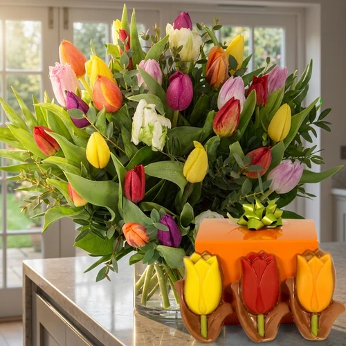 Dit product is gecombineerd met een doosje van 140 gram heerlijke tulpen chocolade.