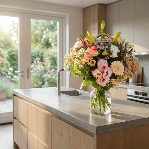 Door de beschikbaarheid van de bloemen kan dit moederdag bloemen boeket pastel roze zalm wit afwijken van de foto. De foto is een indicatie van het te leveren produkt.