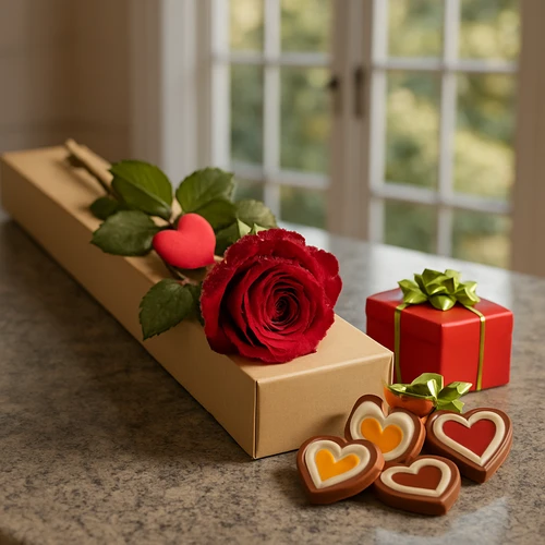 Een rode Red Naomi roos voor jouw geliefde luxe verpakt in een bruine naturel geschenkdoos samen met 150 gram heerlijke handgemaakte bonbons.