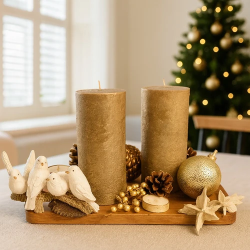Een mooi afgewerkt en gelakt plateau van hard hout. Met twee dikke kaarsen van goud en platina + kerstdecoratie vormen dit geheel tot een waren sfeervolle kerst.