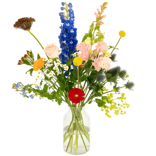 Een plukboeket voorzien van de beste kwaliteit bloemen, waarvan de bloemen in verschillende hoogtes zijn gerangschikt. De kleuren zijn bont maar ook tegelijkertijd op elkaar afgestemd. Dit boeket past helemaal in deze moderne tijd met zijn uitstraling.