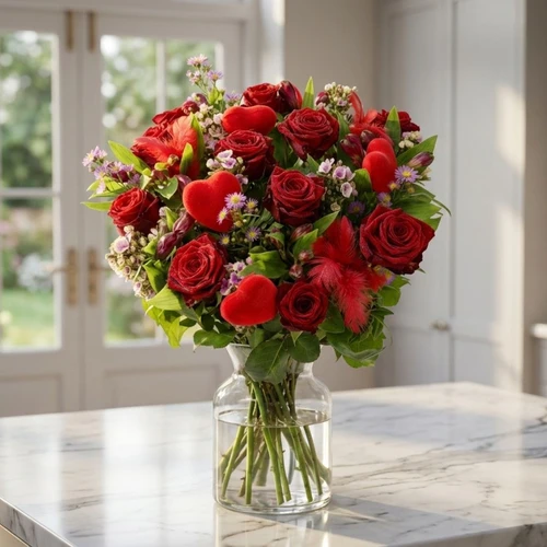 Dit boeket bestaat uit rode rozen die gecombineerd worden met andere roze bloemen. Ook zijn hartjes en rode veertjes in het boeket verwerkt.
