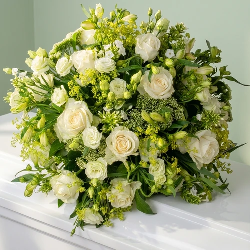 en witte bloemen van het seizoen. Mooi en stijlvol wit rouwstuk.