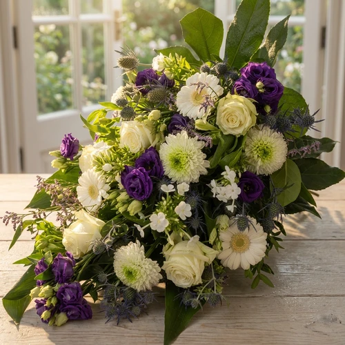 Een rouwboeket voor het laatse moment om afscheid te nemen. Dit rouwboeket is samengesteld met blauw paars en witte bloemen fris van kleur die uitstekend passen bij bijvoorbeeld een man die overleden is.