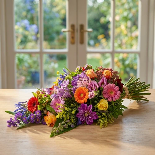 Dit rouwboeket is rijk aan kleur, bijvoorbeeld voor een vrolijk persoon.