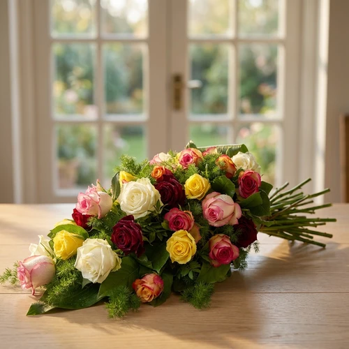 Door de beschikbaarheid kan het rouwboeket mixed rozen afwijken van de foto.