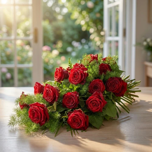 Door de beschikbaarheid van de rode rozen kan het rouwboeket iets afwijken van de foto.