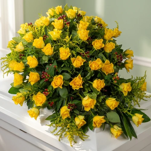 Door de beschikbaarheid van gele rozen kan het rouwstuk afwijken van de foto