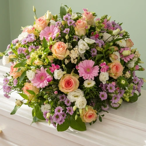 Een rond rouwstuk in de zachte tinten pastel roze wit, opgestoken in steekschuim waardoor de rouwbloemen mooi, en lang vers blijven voor de daadwerkelijke uitvaart.