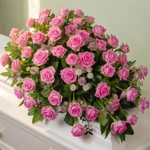 Rouwstuk bestaande uit alléén roze rozen. Eén soort bloemen in een rouwstuk geeft rust en genegenheid.Het is belangrijk dat dit rouwstuk dagelijks wordt bijgevuld met water tot de dag van de uitvaart.