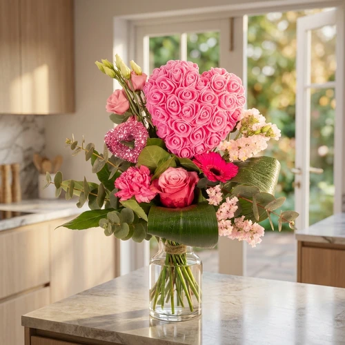 Afgebeeld: de maat large, een roze boeket met een groot hart