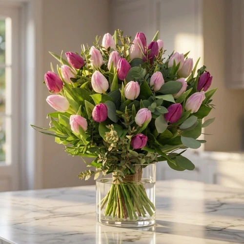 Handgebonden boeket van roze tulpen en afgewerkt met diverse bladamteriaal.