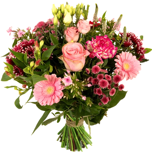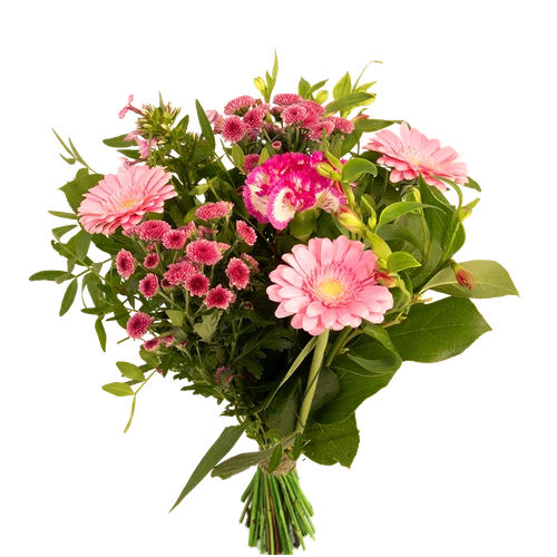 Het boeket omvat in ieder geval een roze gerbera, roze alstroemeria, roze santinichrysant, roze anjer.