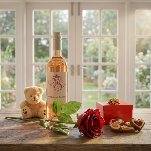 Liefde en eten gaan hand in hand met elkaar. Een heerlijk rosé wijn en hartjes chocolade, tegelijkertijd een herinnering met de knuffel sleutelhanger en voor de liefde een mooie verse rode roos!