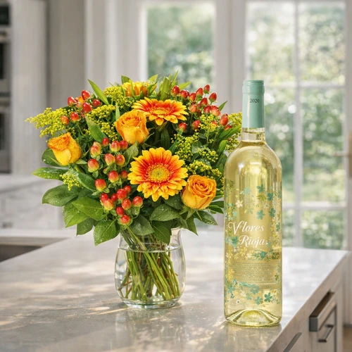 Heerlijke witte wijn uit Spanje met een mooi etiket op de fles. De wijn en bloemen worden samen bezorgd in heel Nederland.