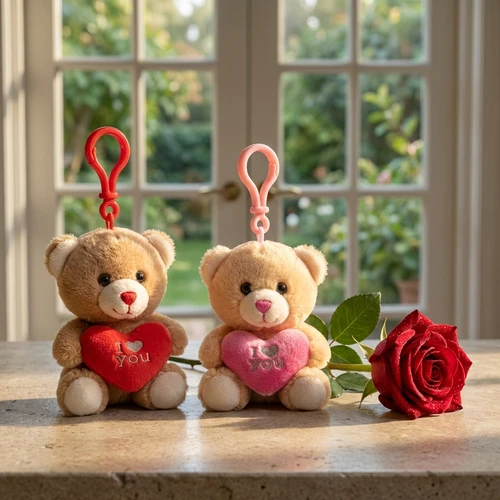 2 mooie zachte pluche knuffel sleutelhangers met een hartje “I love you” in zijn handen. De één is een rood hartje en de ander heeft een roze hartje. Een mooi blijvend liefde cadeau voor jou geliefde. Elke dag draagt ze deze bij zich bij hem of haar sleutelbos.