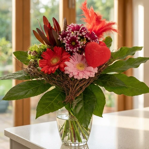 Een boeket in een frame van takjes in de vorm van een hart uitgevoerd met diverse roze en rode bloemen en verschillende bladmaterialen, met uiteraard een extra hart.