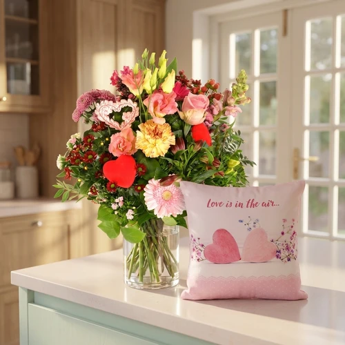 Romantische bloemen in de kleuren roze en rood met een romantisch roze open hart en kleinere rode hartejs. Daarbij heeft BoeketCadeau.nl een combinatie gemaakt met een lig kussen er bij met de tekst: "Love is in the air op het kussen".
